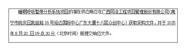 6.采購(gòu)需求:睡眠呼吸暫停分析系統(tǒng)項(xiàng)目1項(xiàng)。具體內(nèi)容詳見(jiàn)本競(jìng)爭(zhēng)性磋商文件。